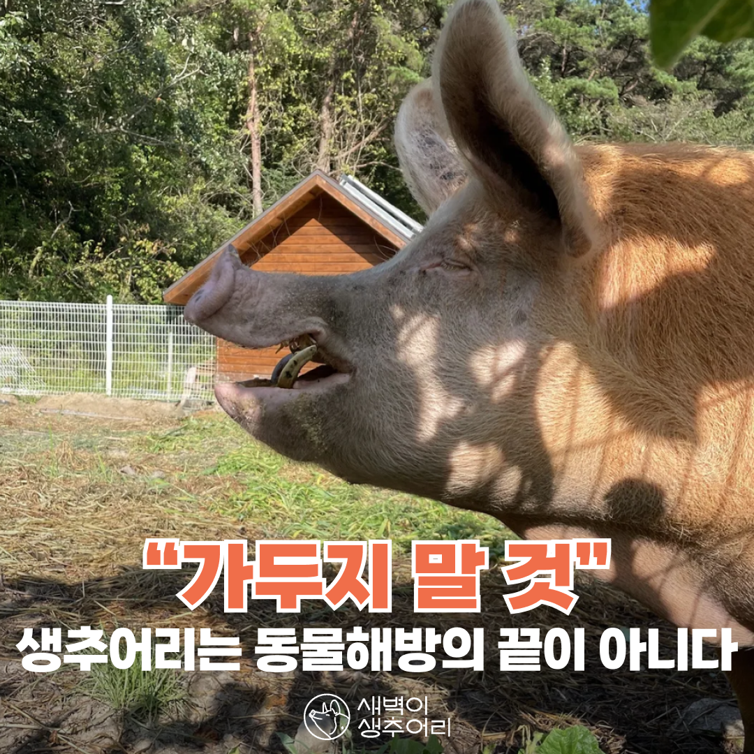 안식처, 피난처라는 의미를 지닌 생추어리(Sanctuary) 또한 ‘시설’이기 때문이다. 새벽은 여전히 감금된 존재이며, 이는 부정할 수 없는 사실이다. 다만 생추어리는 새벽이 구조된 돈사와는 다른 의미의 시설이다. ‘살리는 시설’, ‘돌보는 시설’이라는 점에서 그렇다.