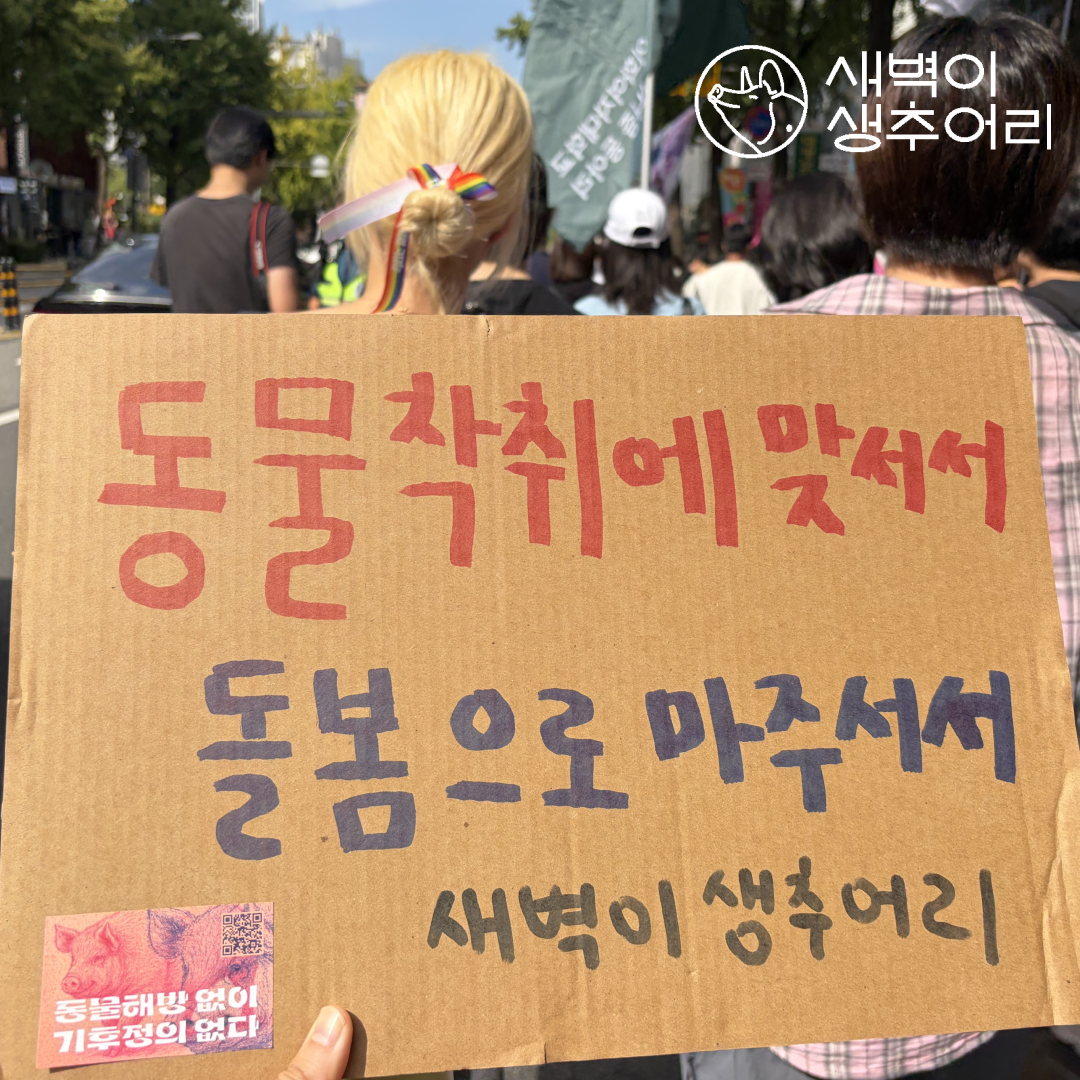 새벽이생추어리는“동물 착취에 맞서서, 돌봄으로 마주서서”라는 피켓을 들고 함께 행진했어요!