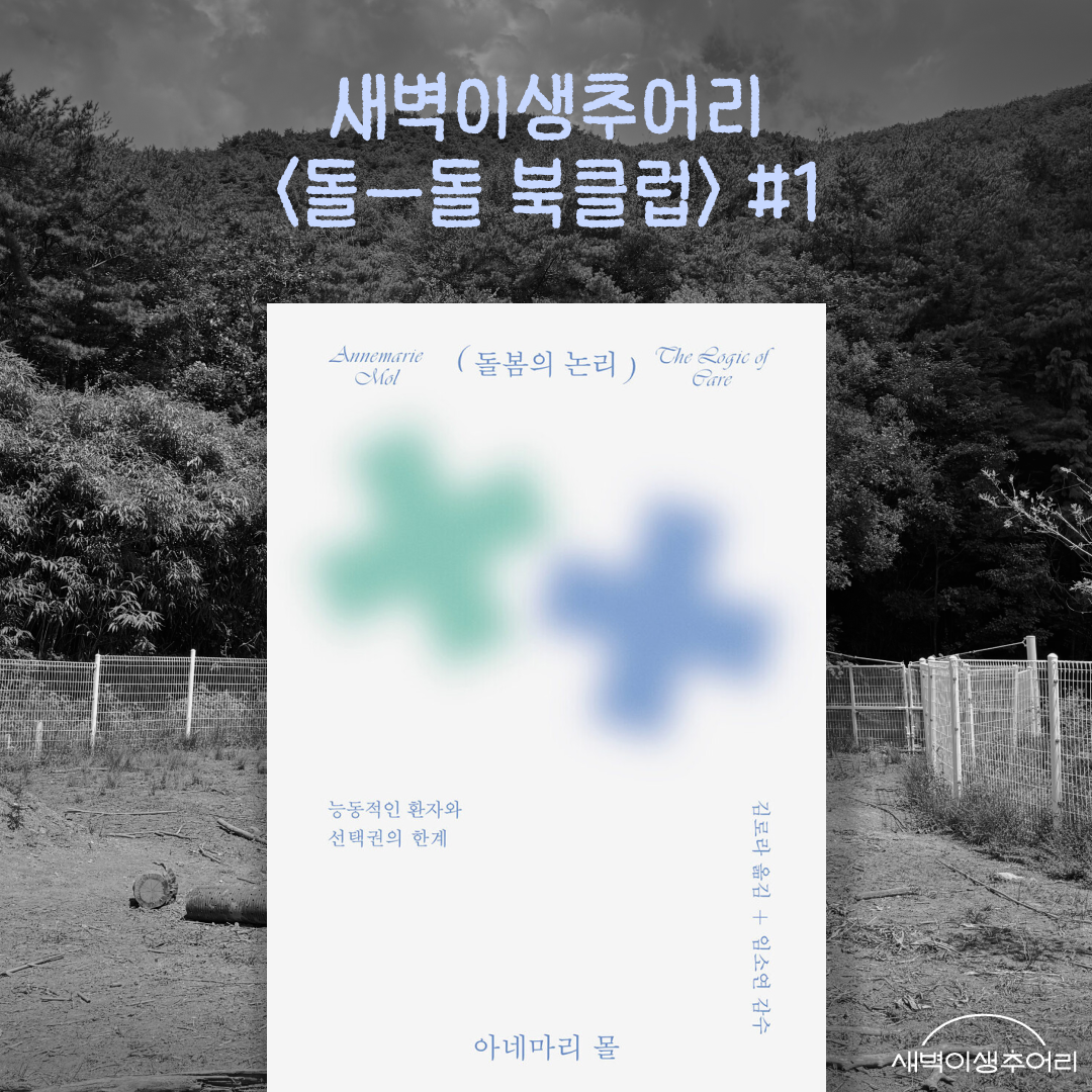 북클럽을 여는 첫 번째 책은 『돌봄의 논리』 (아네마리 몰 저, 갈무리 출판) 입니다. (책 정보 바로가기) 『돌봄의 논리』는 의료 서비스 현장에서 환자와 의료진이 맺는 관계에 대한 저서입니다. 이를 출발점으로 삼아 동물 돌봄에서의 관계성과 실천들로 논의를 확장해보려고 합니다. 오는 10월 29일은 '국제 돌봄의 날'이기도 합니다. 돌봄을 둘러싼 여러 고민과 경험을 나누는 장이 되길 기대합니다!